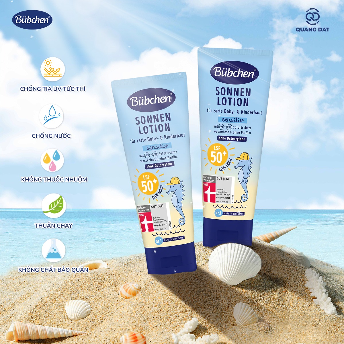 Kem chống nắng Bübchen Sonnenlotion LSF 50+ là sản phẩm được phát triển với công thức thuần chay, an toàn cho làn da và môi trường. Đây là dòng kem chống nắng vật lý, sử dụng bộ lọc khoáng thiên nhiên để tạo lớp màng bảo vệ da khỏi tác hại của tia UVA/UVB với chỉ số chống nắng cao lên đến LSF 50+. Sản phẩm có dung tích 100ml, phù hợp để sử dụng hàng ngày cho cả gia đình, đặc biệt là cho làn da trẻ nhỏ nhạy cảm.